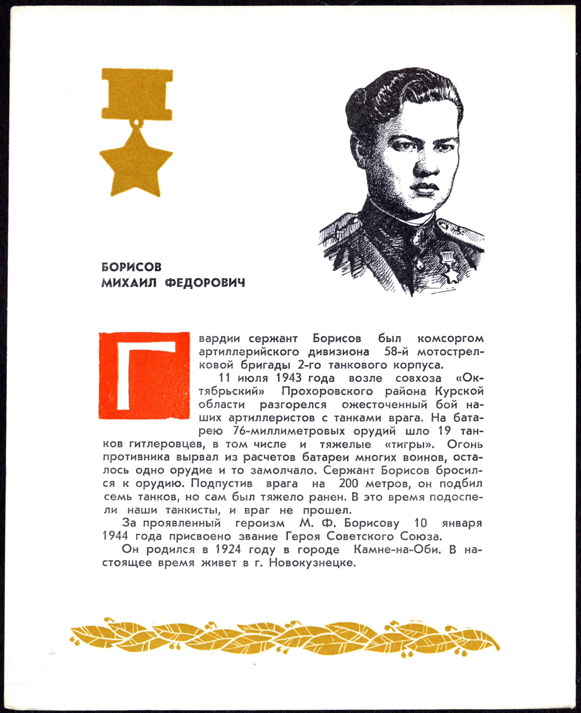 Полный текст (pdf, 3,90 Мб) - Борисов Михаил Федорович // Боевая слава Алтая. Герои Советского Союза - наши земляки / [сост. М. Т. Карначев, Ф. П. Ельков]. - [Изд. 3-е, испр. и доп.]. - Барнаул : Алт. кн. изд-во, 1978. - С. 36.