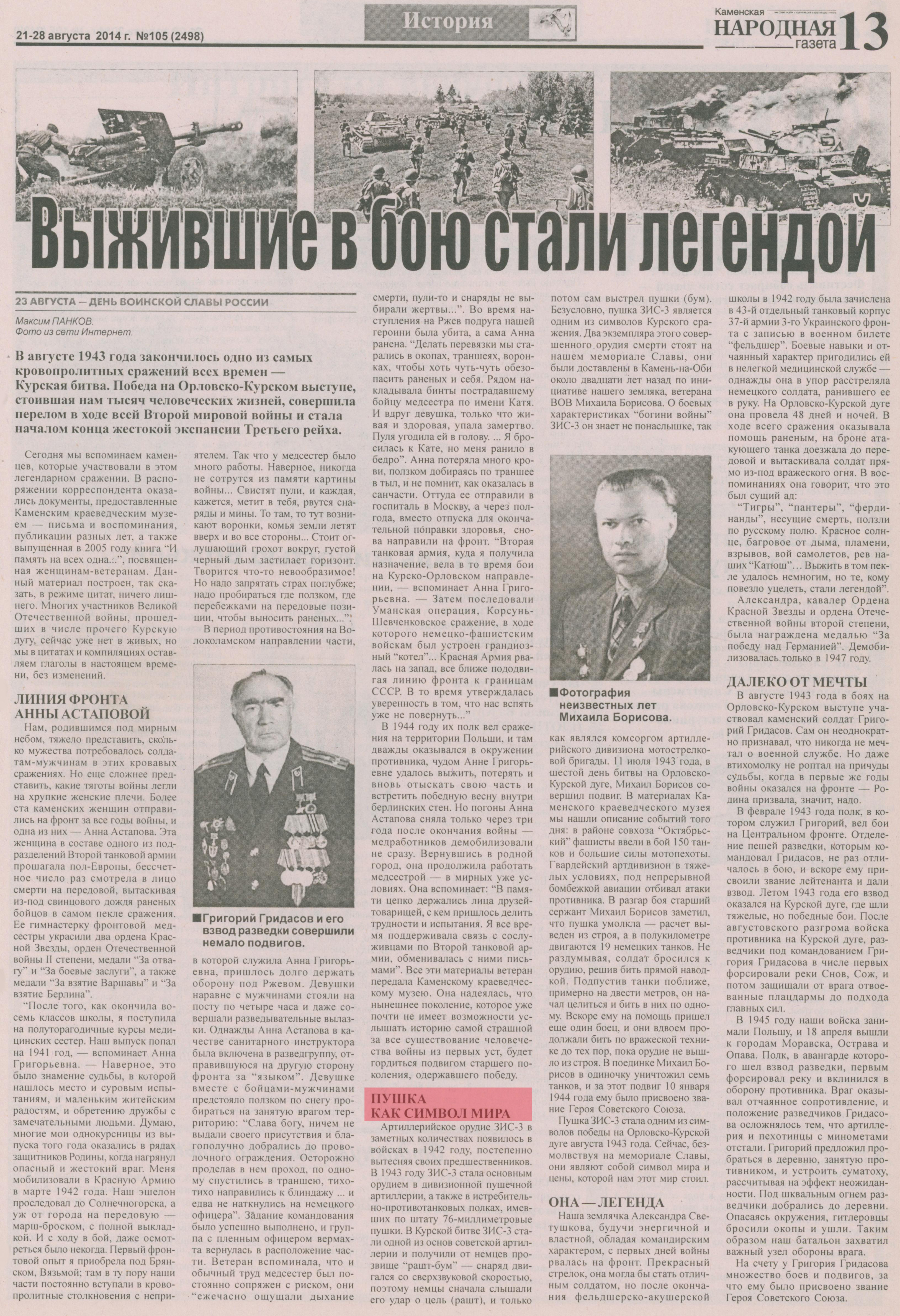 Полный текст (jpeg, 7,83 Мб) - Панков, М. Выжившие в бою стали легендой / М. Панков // Каменская народная газета. - 2014. - № 105, 21-28 авг. - С. 13 : фото.