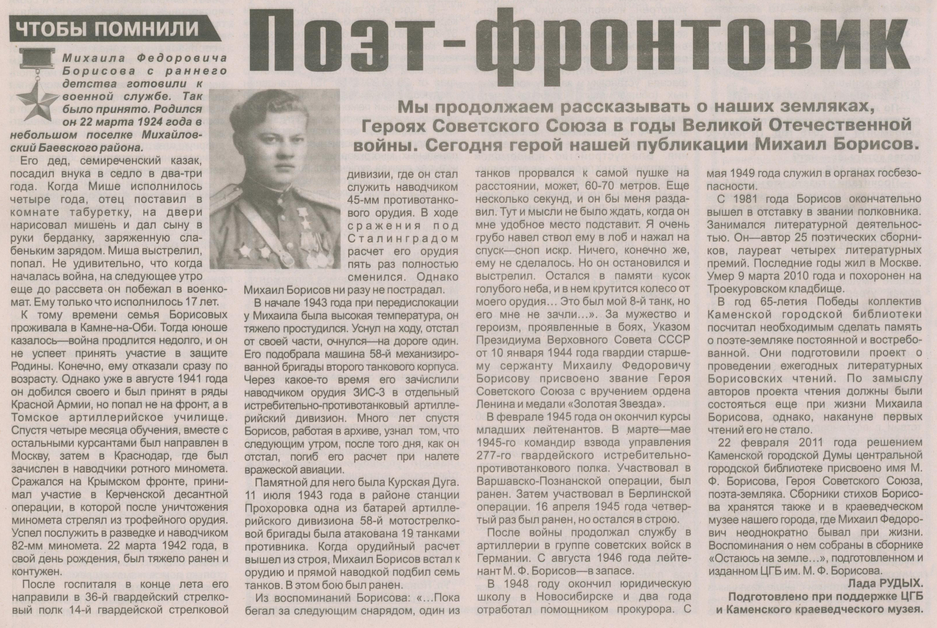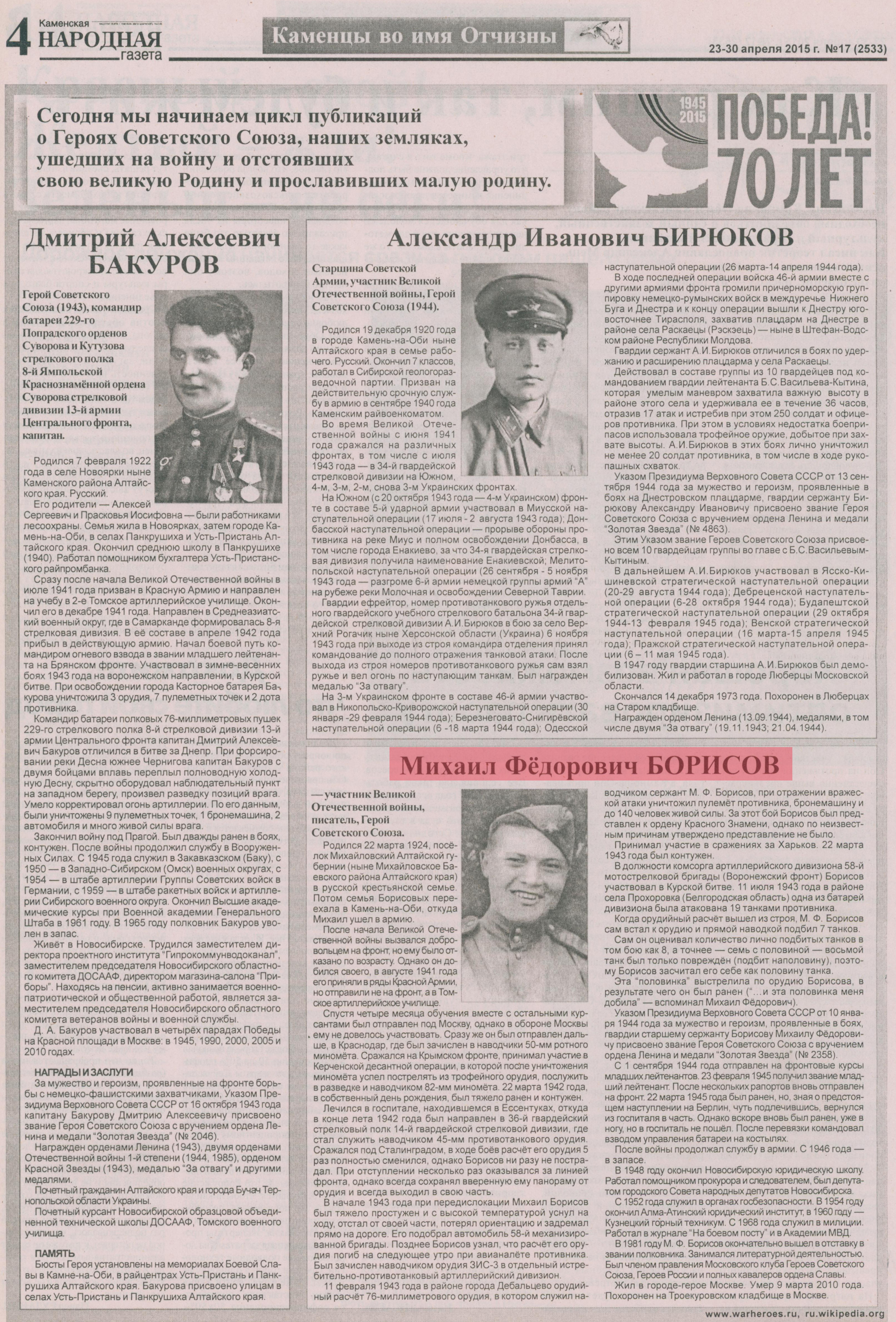 Полный текст (jpeg, 1,83 Мб) - Каменцы во имя Отчизны : [Михаил Федорович Борисов] // Каменская народная газета. - 2015. - № 17, 23-30 апр. - С. 4.