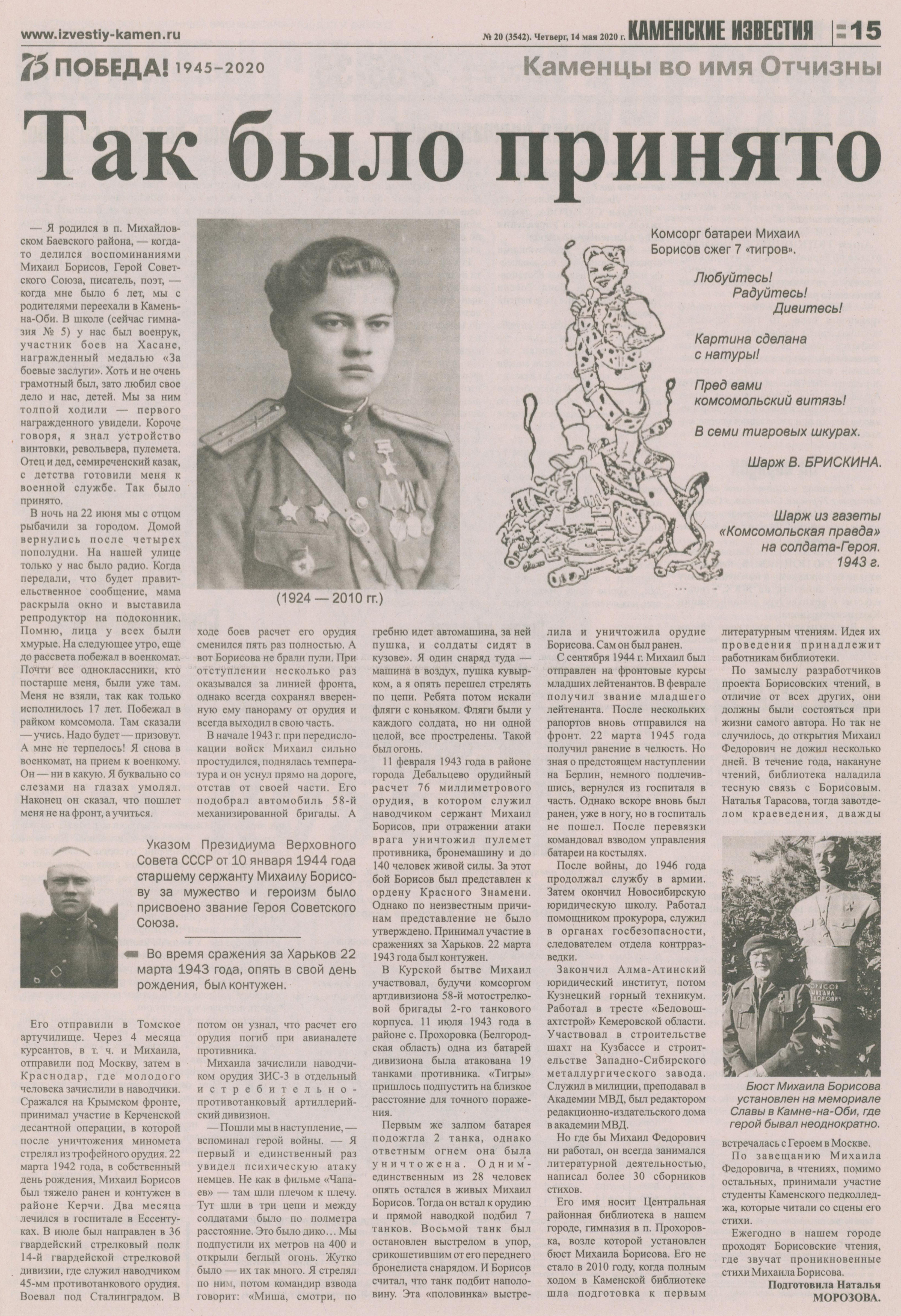 Полный текст (pdf, 5,49 Мб) - Морозова, Н. Так было принято / Н. Морозова // Каменские известия. - 2020. - № 20, 14 мая. - С. 15 : фото.