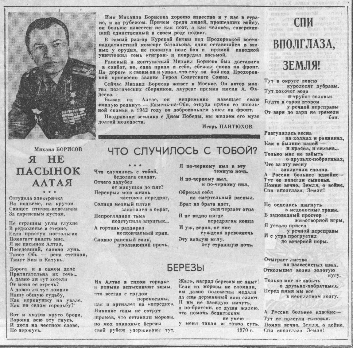 Полный текст (pdf, 376 Кб) - Борисов, М. Я не пасынок Алтая; «Что случилось с тобой…»; Березы; Спи вполглаза, Земля : стихи / М. Борисов ; вступ. ст. И. Пантюхова // Алтайская правда. - 1991. - № 92, 9 мая. – С. 2.