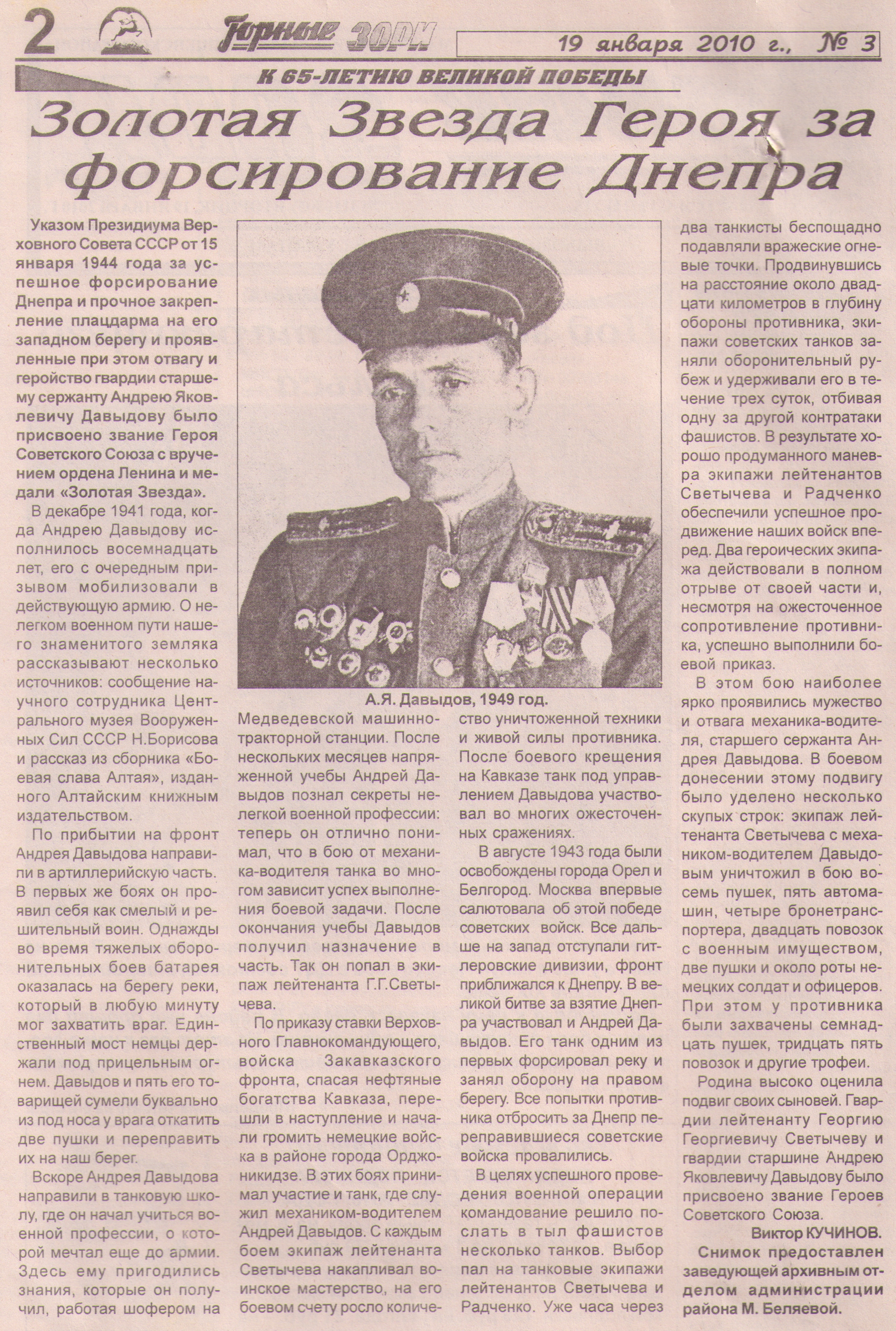 | 5. | Исаева, Наталья. "Огонь на себя" : герой Советского Союза Дмитрий Бакуров с удовольствием приезжает на малую родину // Алтайская правда. - 2013. - № 156-158, 31 мая. - C. 1-3: фот. цв. Полный текст (pdf, 3,29 Мб) |