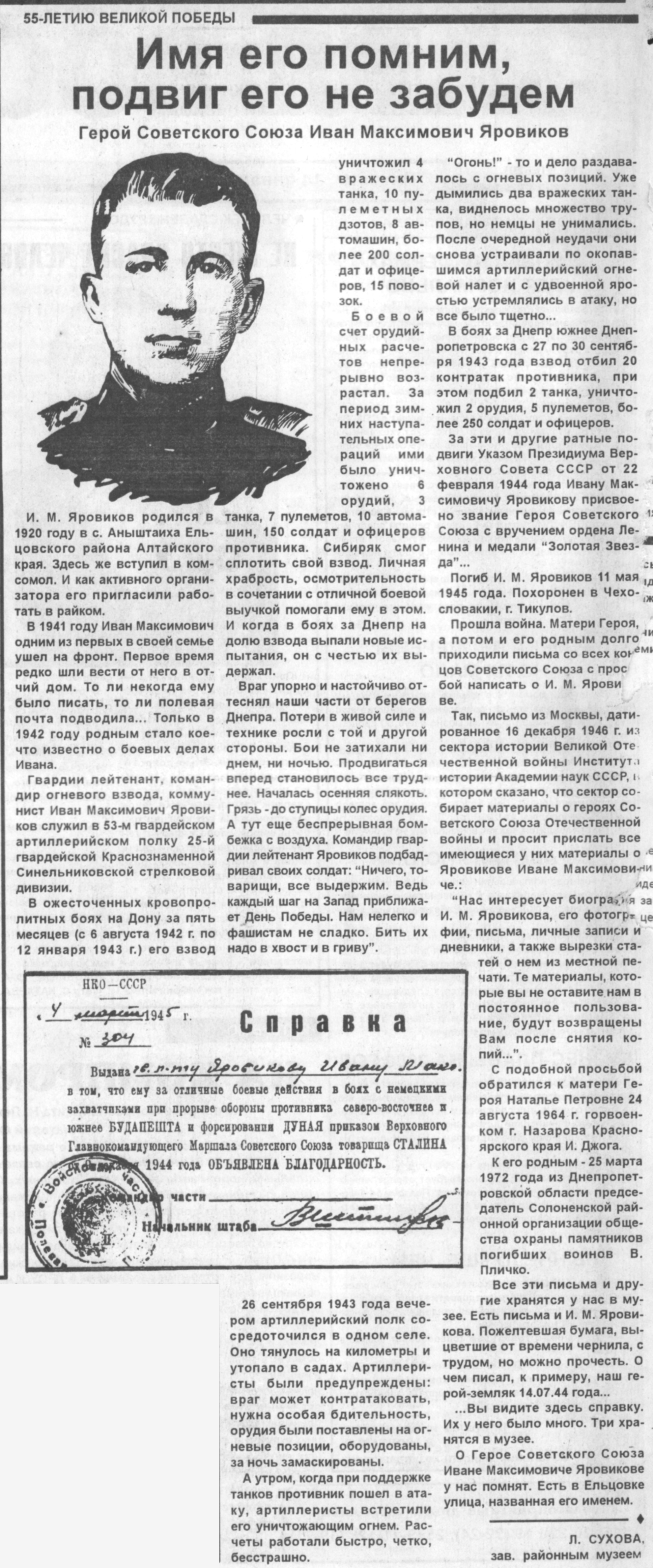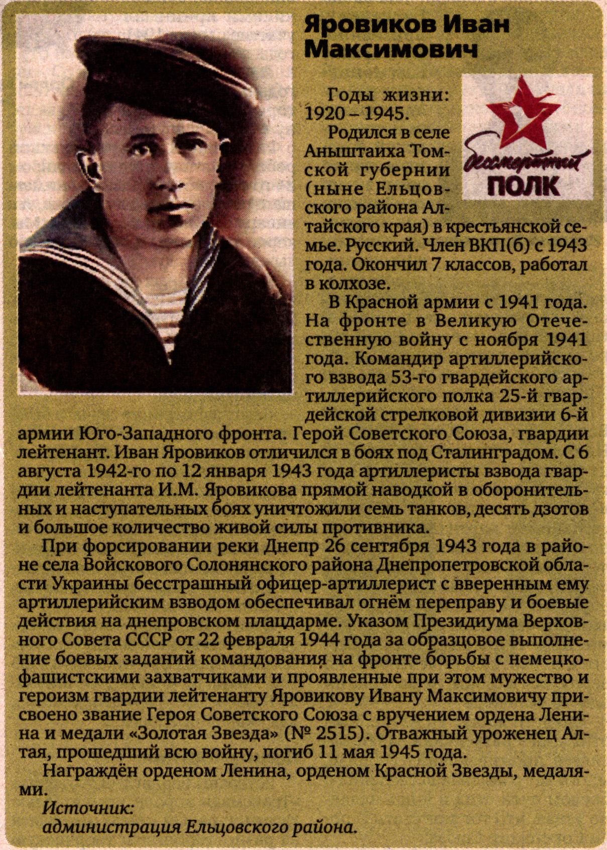 Полный текст (jpg, 1,42 Мб) - Яровиков Иван Максимович // Боевая слава Алтая. Герои Советского Союза - наши земляки / [сост. М. Т. Карначев, Ф. П. Ельков]. - [Изд. 3-е, испр. и доп.]. - Барнаул : Алт. кн. изд-во, 1978. - С. 305.