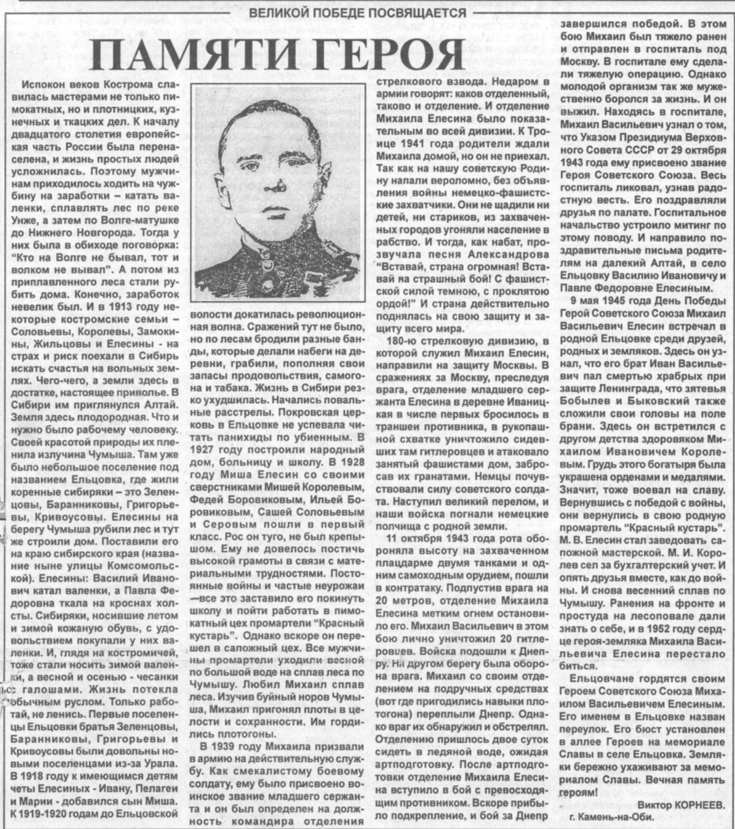 В тяжелые для нашей Родины дни 1941 года 107-я дивизия сибиряков с Алтая была послана для разгрома немецко-фашистской группировки в районе Ельни. Совместно с другими дивизиями она остановила здесь врага и нанесла ему огромный урон.