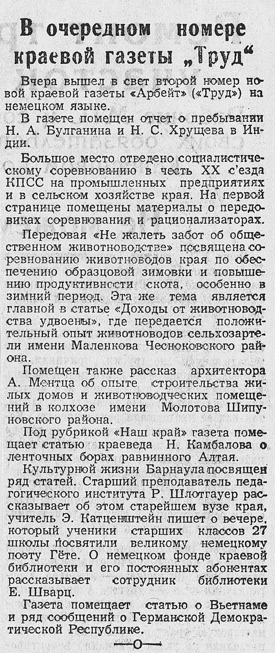 «Arbeit» : газета : organ des Gaukomitees der KPdSU und des Gausowjets der Deputierten der Werktatigen vom Altaigau. — Barnaul : [б. и.], 1955 — 1957 (Тип. изд-ва » Алт. правда»).- Выходит дважды в неделю.