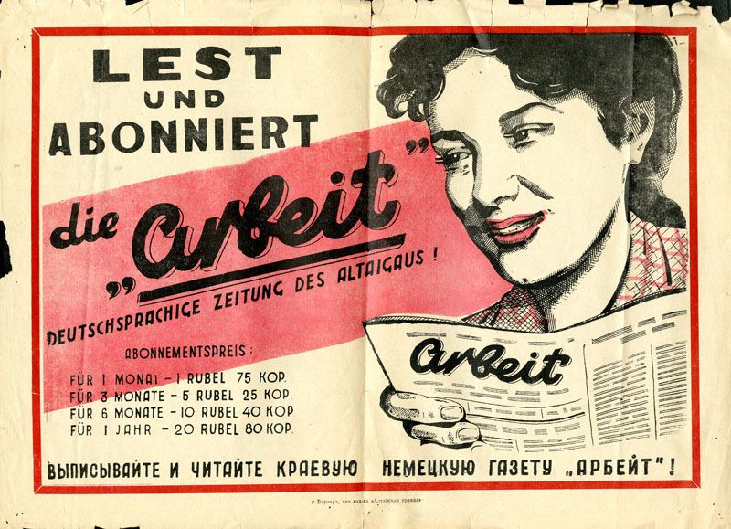 Далее: историческая справка; газета «Arbeit»; о газете «Арбайт»; фотографии, архивные документы.