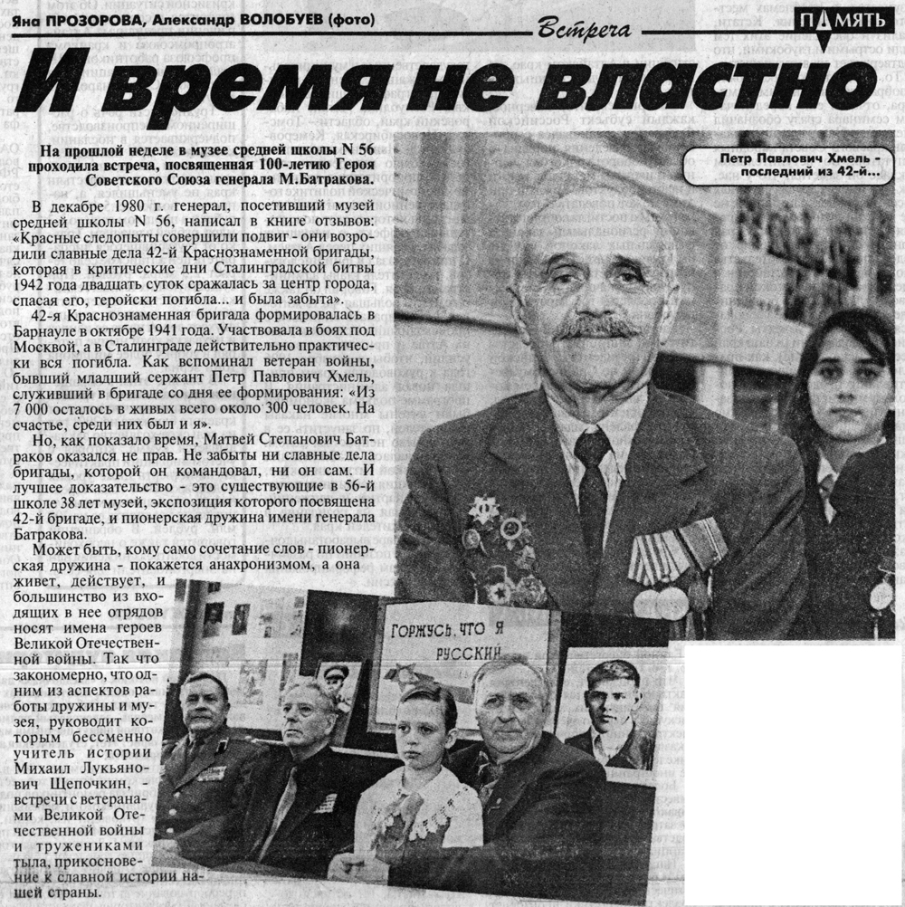 | 13. | Щепочкин М. Так и шел с Россией : [К 100-летию со дня рождения Героя Сов. Союза М. С. Батракова, командующего 42-й стрелковой бригадой в годы ВОВ, сформированной в Барнауле] / Щепочкин М. // Алтайская правда. - 2000. - № 267, 15 нояб. - С. 2. Полный текст (jpg, 1,43 Мб) |