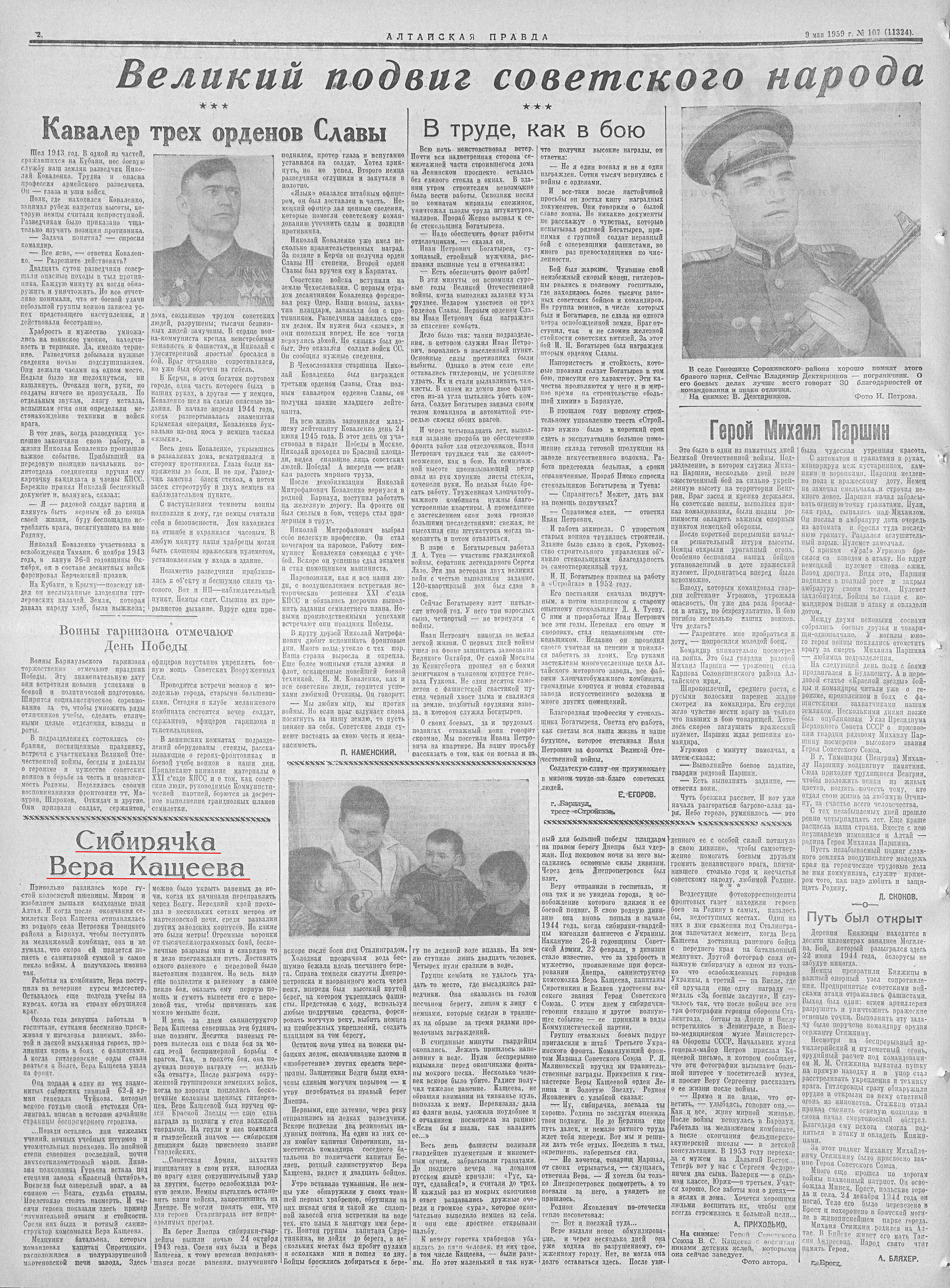 | 10. | Приходько А. Сибирячка Вера Кащеева // Алтайская правда. - 1959. - № 107, 9 мая. - С. 2. Полный текст (jpeg, 1,99 Мб) |