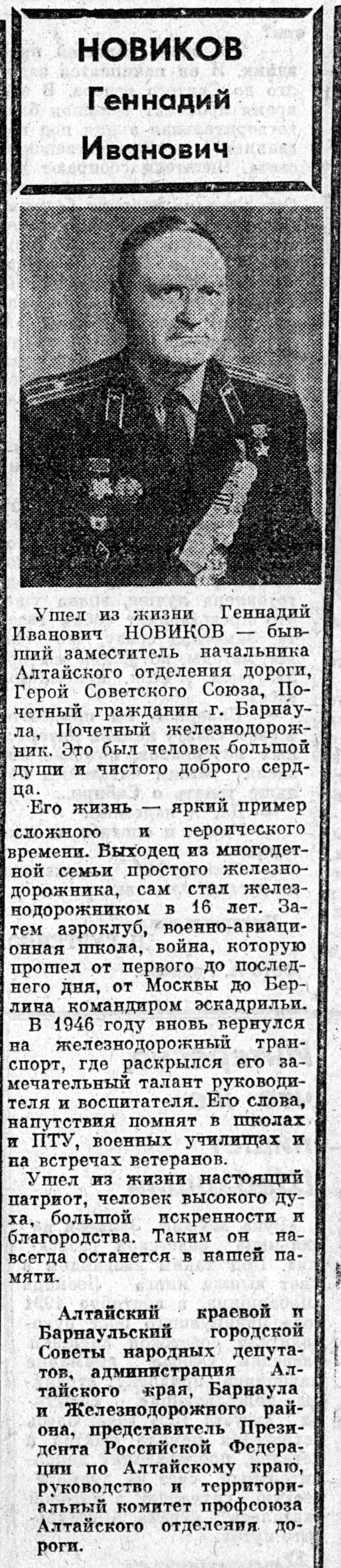 | 4. | Новиков Г.И. : [Бывший зам. нач. Алт. отд-ния дороги, Почетный железнодорожник, Герой Сов. Союза, Почетный гражданин Барнаула. Некролог] // Алтайская правда. - 1993. - № 3, 6 янв. - С. 4.: портр. Полный текст (jpeg, 754 Кб) |