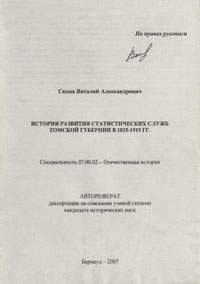 | 6. | Скопа, В. А. История развития статистических служб Томской губернии в 1835–1919 гг. / В. А. Скопа ; рец. М. О. Тяпкин // Правоведение и социально-гуманитарное знание в диссертационных исследованиях. – Барнаул, 2009. – C. 226–231. Полный текст (pdf, 2,54 Мб) | |