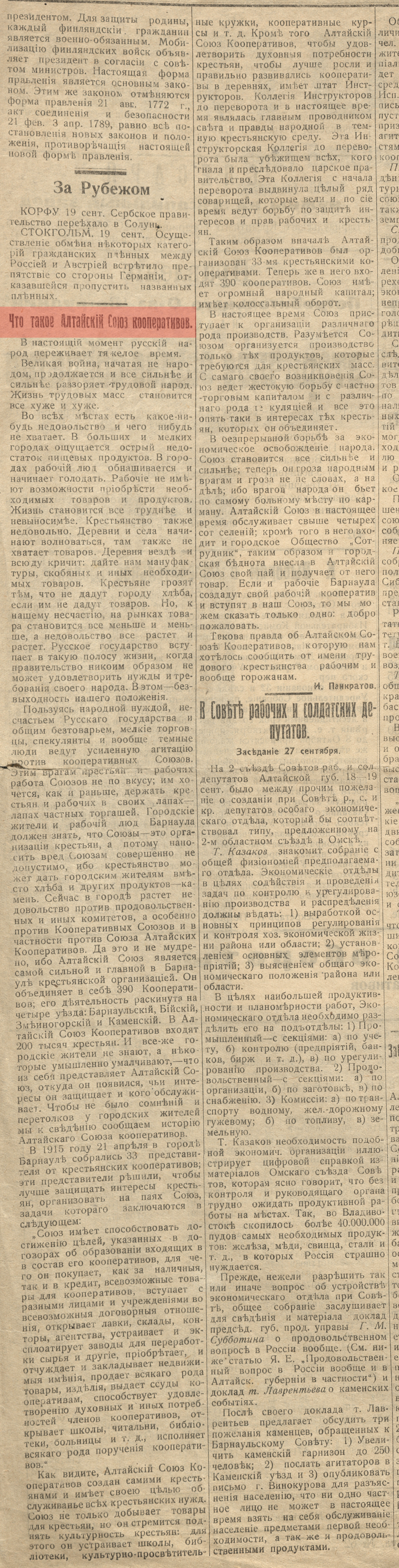 | 4. | Панкратов, И. Что такое Алтайский союз кооперативов // Голос труда. - 1917 г. - № 48. - С. 3. Полный текст (jpg, 7,93 Мб) |