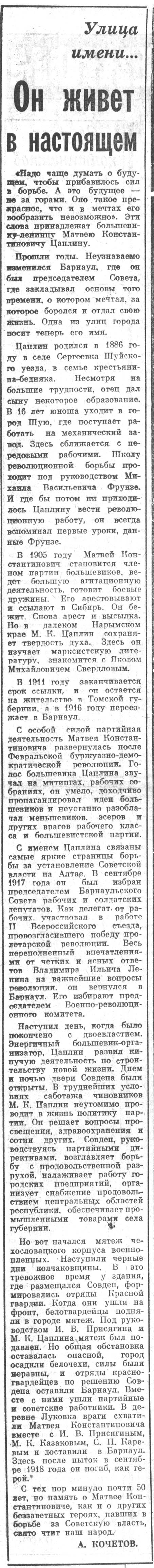 Полный текст (pdf, 35,1 Мб) - Комаров, В. Здесь жил партизанский главком // Алтайская правда. - 1977. – № 265, 11 нояб. – С. 4.